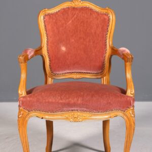 Dieser elegante Chippendale Armlehnstuhl verbindet klassische Handwerkskunst mit zeitlosem Design. Der Sessel besticht durch seine charakteristische geschwungene Rückenlehne und fein gearbeiteten Holzbeine im authentischen Chippendale-Stil. Der luxuriöse Samtbezug schmeichelt sowohl dem Auge als auch der Haut und verleiht jedem Raum – ob Arbeitszimmer, Wohnzimmer oder Schlafzimmer – eine Atmosphäre von Raffinesse. Die großzügigen Armlehnen bieten komfortables Anlehnen, während die stabile Konstruktion langfristige Qualität garantiert. Ein Statement-Möbelstück für anspruchsvolle Sammler und Liebhaber klassischer Möbelkunst.